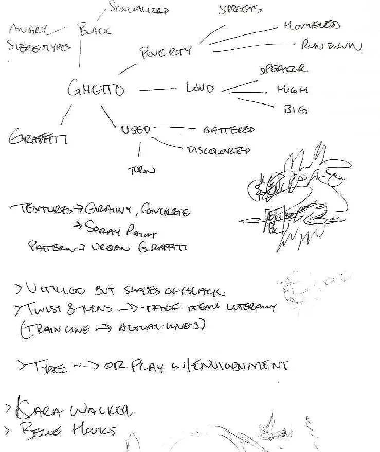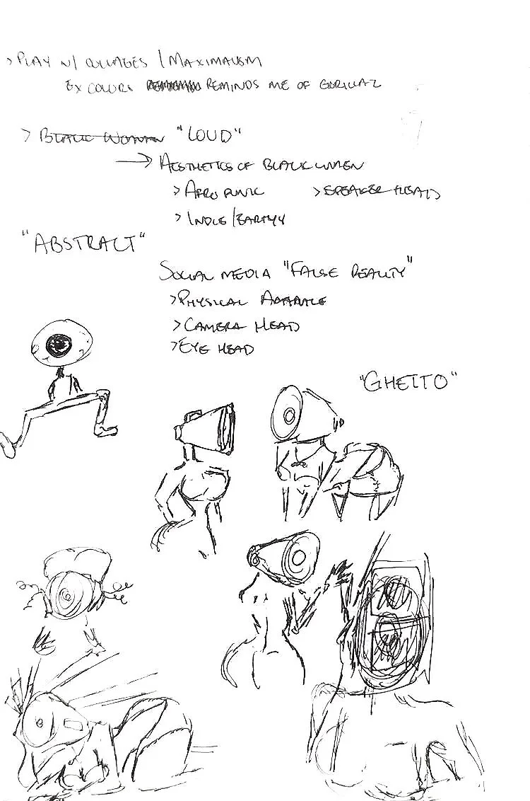 Original sketches and mind map included the most heard or first adjectives thought of when society refers to a black woman. Despite the many words, while ghetto is the most used adjective, a lot of these key words are used in a derogative matter. I realized I wanted to exaggerate the biggest standout word and make it as feminine and illustrate it in a way that makes black women proud and unbothered to be referred to as such.